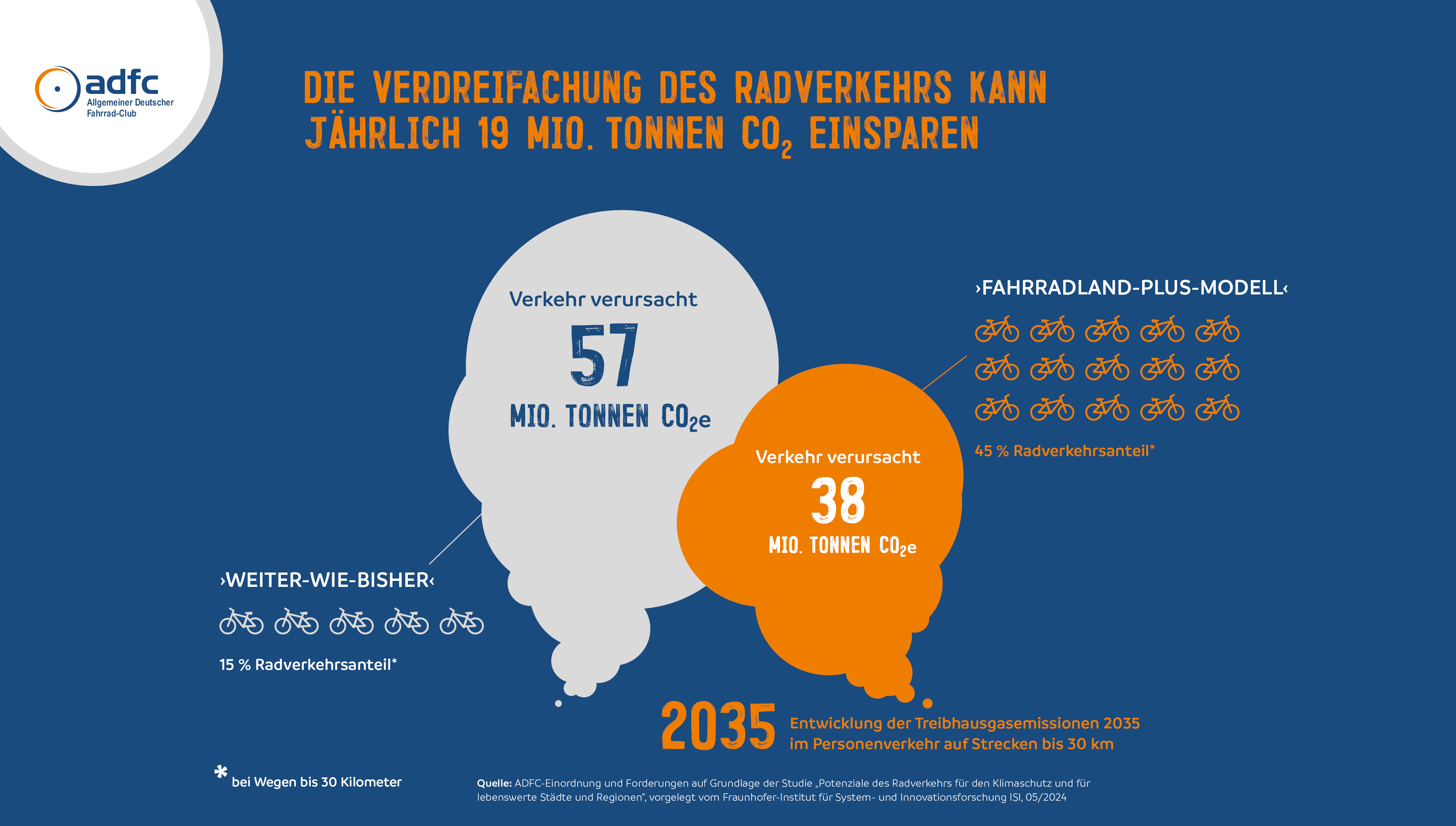 Deutschland hat das Potenzial, den Radverkehrsanteil an Wegen bis 30 Kilometer Länge bis 2035 zu verdreifachen und die Verkehrsemissionen im Nahbereich um 34 Prozent zu reduzieren. 19 Millionen Tonnen CO2-Äquivalente können jährlich eingespart werden, wenn die Radwege hervorragend ausgebaut, gute Schnittstellen mit Bus und Bahn geschaffen und die Kommunen fahrradfreundlich mit kurzen Wegen geplant werden. Das belegt eine Studie des Fraunhofer-Instituts für System- und Innovationsforschung ISI, die der Fahrradclub ADFC in Auftrag gegeben und heute in Berlin vorgestellt hat.
